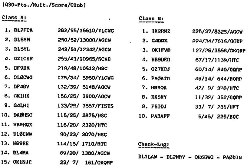 Klasse A: Pos. Call Punkte/Multis/Ergebnis/Klub 1 DL2FCA 282/55/15510/YLCWG 2 DL5YM 250/52/13000/AGCW 3 DL5YL 242/51/12342/AGCW 4 OZ1CAR 255/43/10965/SCAG 5 DF9DM 219/48/10512/HSC 6 DLØCWG 175/34/5950/YLCWG 7 DF4BV 132/39/5148/AGCW 8 OK1HX 156/25/3900/AGCW 9 G4LHI 133/29/3857/FISTS 10 DAØHSC 115/25/2875/HSC 11 HB9HQX 116/20/2320/HTC 12 DLØCWW 90/23/2070/HSC 13 HB9RE 114/15/1710/HTC 14 DL4MA 69/20/1380/AGCW 15 OK1NJC 23/7/161/OKQRP Klasse B: Pos. Call Punkte/Multis/Ergebnis/Klub 1 IK2RMZ 225/37/8325/AGCW 2 G4DDX 224/34/7616/GQRP 3 OK1FVD 127/28/3556/OKQRP 4 HB9DEO 67/17/1139/HTC 5 OZ7KDJ 60/14/840/GQRP 6 PAØATG 46/14/644/BQRP 7 HB9QA 42/9/378/HTC 8 DK5RY 11/32/352/GQRP 9 F5IQJ 33/7/231/UFT 10 PA3AFF 5/45/225/BQC Check-Log: DL1LAW, DL2NBY, OE6GWG, PAØDIN Meinungen zum Contest: DK5RY: Trotz wenig Zeit, viel QRM/QRN, hat die Party wieder Spaß gemacht. PA3AFF: Happy to be present this year again, meeting cw friends. HB9QA: Konnte leider wegen anderer Beanspruchungen nur wenig QRV sein. OZ1CAR: Nice to meet "old friends". But problems with other tests same time. HB9RE: Es hat wieder viel Spaß gemacht. G4DDX: For me the band conditions were very poor. On 14 Mhz I heard only one DL but could not work him. DL2FCA: Dieses war meine 14. Teilnahme in Folge, HI! Leider waren die Bänder voll von LZ-Contest-Stationen, sodass es nicht ganz einfach war dem ganzen QRM zu trotzen! Schade, dass auf 20m so wenig zu arbeiten war. Anmerkung: Etliche Teilnehmer haben es versäumt, ein "Summary Sheet" zu fertigen.
